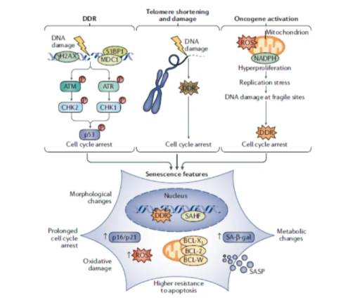 核DNA损伤通常与衰老建立有因果关系。DNA损伤反应(DDR)会引起一系列的信号调节,最终引发细胞周期阻滞。故延长DDR激活会引发衰老。